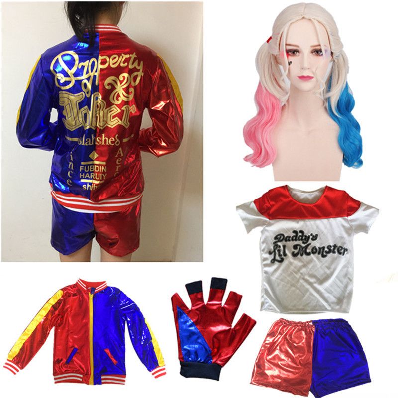 5pcsset Girls Harley Quinn T Shirts Top Jacket Wig Glove Costume