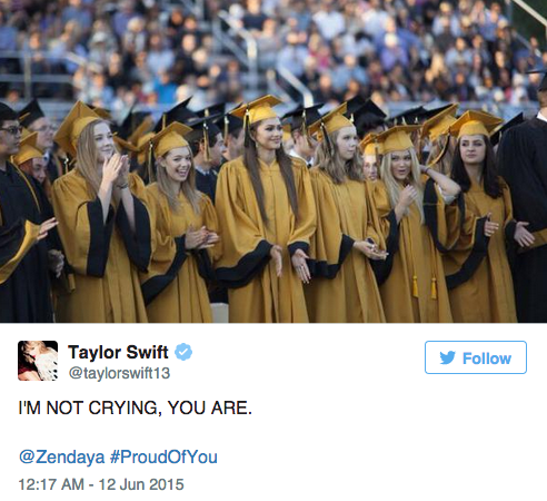 A graduation cap and gown. Zendaya made taylor swift cry in the good way. Her bad blood bff taylor swift was also excited for her commenting on twitter im not crying you are.